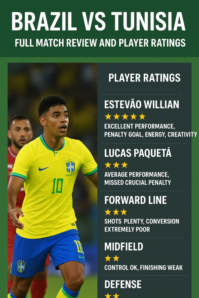 Brazil vs Tunisia: Full Match Review and Player Ratings इस रोमांचक मैत्री मैच में भले ही स्कोरलाइन 1–1 रहा हो, लेकिन मैच ने ब्राज़ील टीम के प्रदर्शन पर कई सवाल खड़े कर दिए। टीम की प्रतिभा और आक्रामक खेल के बावजूद मौके को गोल में बदलने की क्षमता एक बड़ी चुनौती बनती दिखाई दी। आइए इस मैच के प्रदर्शन और खिलाड़ियों की रेटिंग्स का विस्तृत विश्लेषण करते हैं।